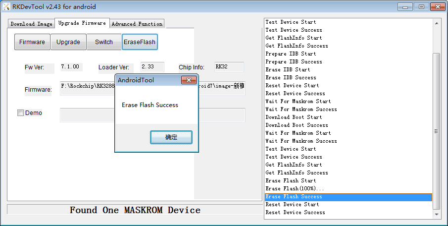 Step 4, click Upgrade Firmware -> Firmware, select update.img, click EraseFlash to erase flash. After erase flash will enter Maskrom mode.